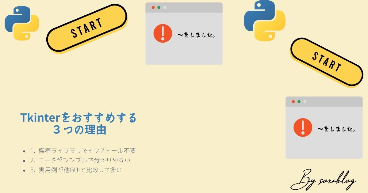 Tkinterは標準ライブラリでPythonをインストールすれば即扱えますし、GUIを触れるにはもってこいのライブラリです。